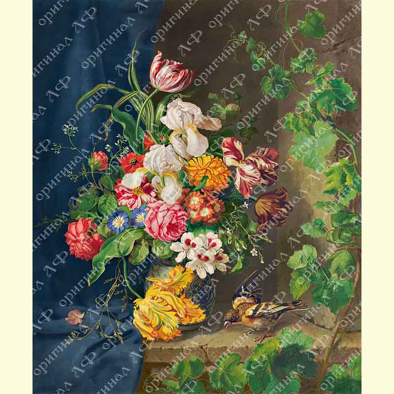 1040 Натюрморт с цветами, воробьём и виноградной лозой